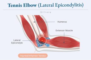 - Tennis Elbow Anatomy: Overuse injury causing pain on the outside of the elbow, often due to repetitive wrist and arm motions, as illustrated below: